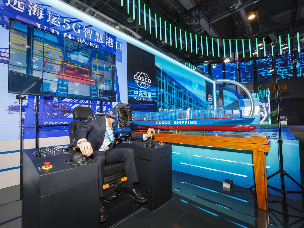 11月23日,在第二届全球数字贸易博览会上,工作人员戴上VR眼镜,展示智慧港口远程操控吊车设备。新华社记者 徐昱 摄 “在供应链、市场、技术等全球数字贸易核心要素方面,中国都具备较强的竞争优势。”跨境贸易数字化服务商、PingPong公司联合创始人卢帅说。 拥抱数字化浪潮,我国前瞻布局数字化建设,培育肥沃的“数字土壤”,由此构筑对外贸易新优势。 数贸会综合馆里一组数据显示:2022年,中国数据产量达8.1ZB,同比增长22.7%,占全球数据总产量的10.5%,位居全球第二;中国数字经济规模达50.2万亿元,总量稳居世界第二。