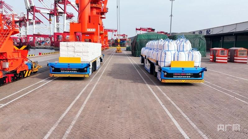 智能引导运输车装载货物在码头穿梭(央广网记者 唐磊 摄)