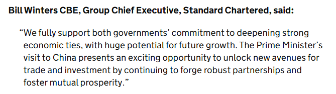 我们全力支持两国政府深化牢固经济关系的承诺,这蕴含着巨大的未来增长潜力。英国首相访华为持续构建稳健伙伴关系、促进共同繁荣提供了重要契机,有望开辟贸易投资新通道。”