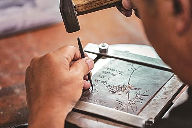 匠人在铜板上錾刻纹路凹槽。新华社发