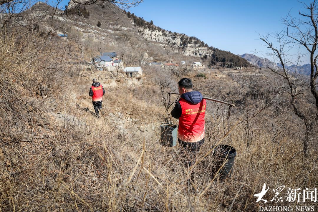 挑水的路不好走,两名志愿者换班挑。