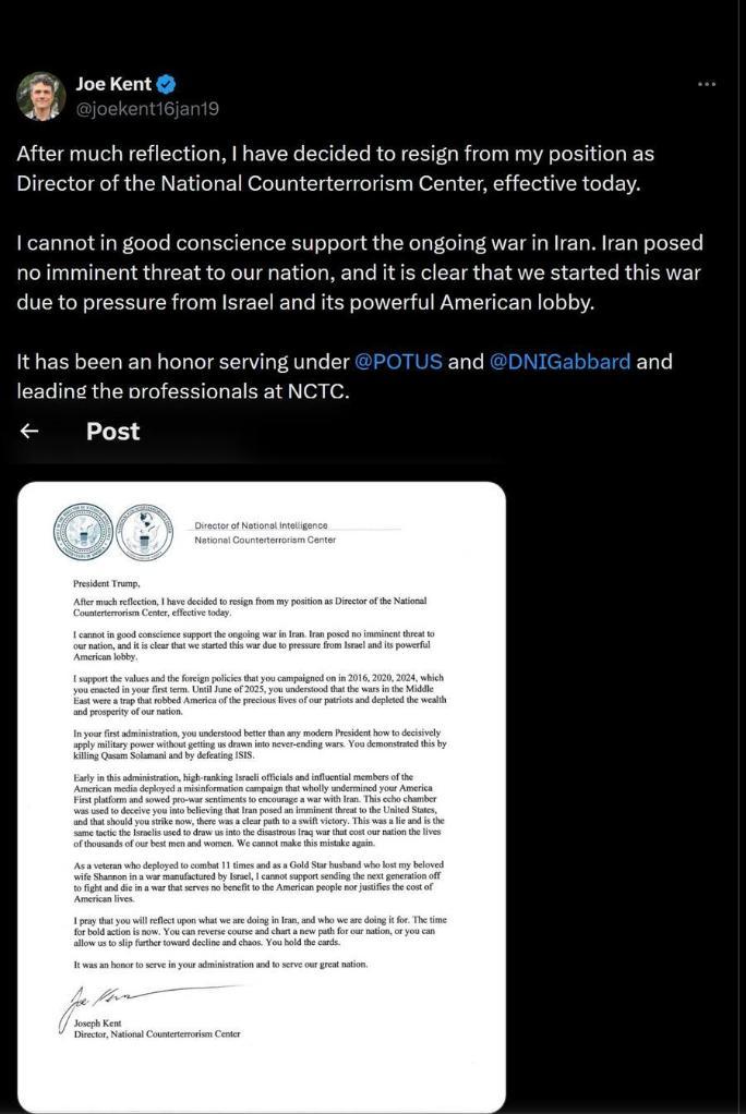 肯特在信中写道:“我无法昧着良心支持正在进行的伊朗战争。伊朗并未对我国构成迫在眉睫的威胁,而且很明显,这场战争是迫于以色列及其在美强大游说集团的压力而发动的。”他在信中指责以色列政府高级官员和美国有影响力的媒体“鼓动与伊朗开战”。