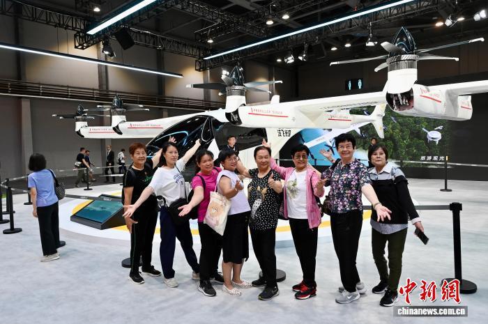2025年6月12日,2025国际汽车及供应链博览会(香港)在香港亚洲国际博览馆举办。图为民众与沃飞长空电动垂直起降航空器合影。(资料图)中新社记者 李志华 摄