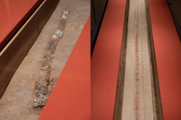 ▲陶寺遗址出土的圭尺(左)和圭表(右)局部