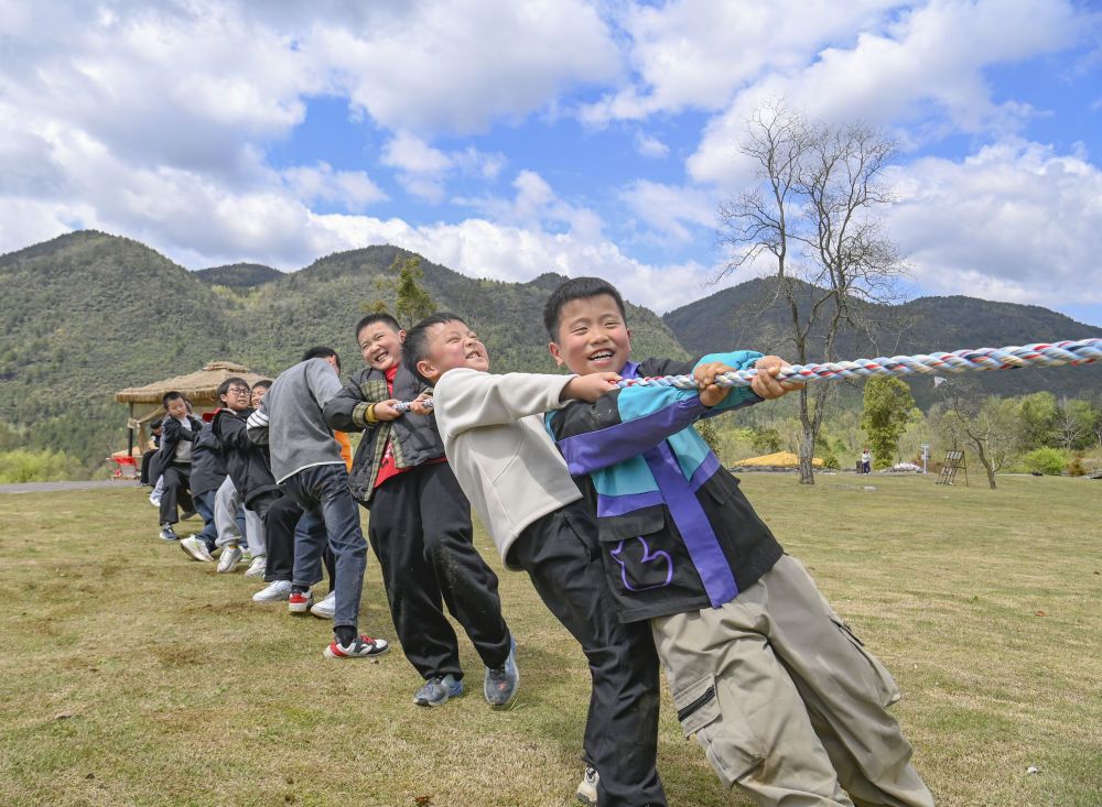 ↑4月3日,孩子们在重庆市酉阳土家族苗族自治县叠石花谷景区参加趣味拔河活动。新华社发(冉川摄)