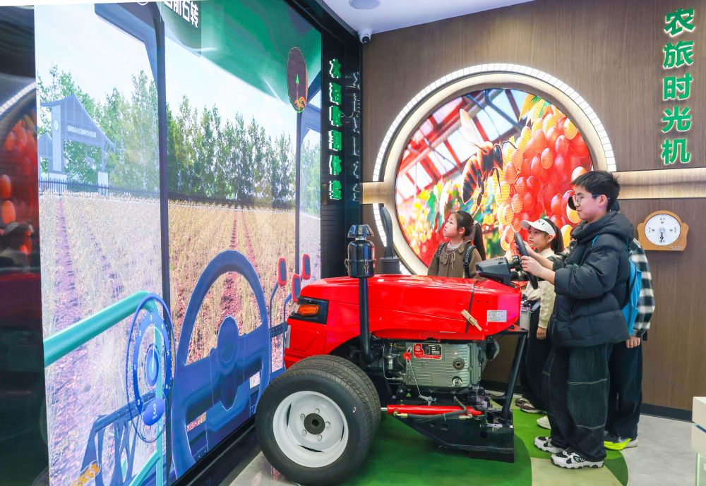 ↑4月2日,在江苏省江都现代农业产业园,孩子们模拟驾驶拖拉机。新华社发(任飞摄)
