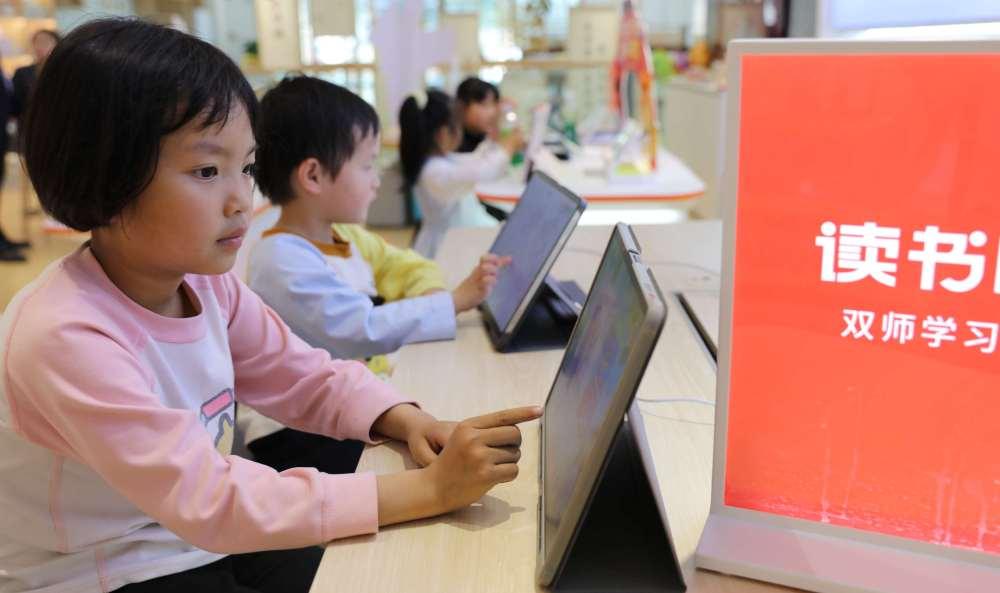 ↑4月3日,四川省宜宾市长宁县的小朋友在新华文轩阅读电子书。新华社发(刘龙泉摄)