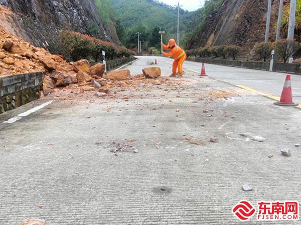 桂口公路站职工正在黄溪坑村路段清移落石。 东南网3月17日讯(通讯员 徐紫莹 邓林宁 张云璐)3月15日凌晨1时许,沙县桂口公路站站长黄水南接到险情消息:省道308线沙县区黄溪坑村路段有落石占据路面,影响通行安全。黄水南迅速组织值班人员到达现场查看,只见路面上散落大大小小的石块约75方,其中,较大块的落石无法依靠人力实现快速清除,需要机械配合清运。 考虑现场情况后,黄水南当即组织人员对现场进行安全布控,将小块落石清扫干净、大块落石移动到同一边,确保有半幅路面可安全通行。同时,在该路段前后都设置了标志标牌,提醒过往司乘人员注意。为进一步确保通行安全,黄水南和值班人员留在附近安全区域进行现场值守,天一亮,他们便拿着铁锹、铁锤、扫帚等工具,将落石清移到路肩,等待机械支援。截至目前,三明市公路事业发展中心沙县分中心管养路段共发生树木倒伏5处,溜方落石4处,投入抢险人员26人次。